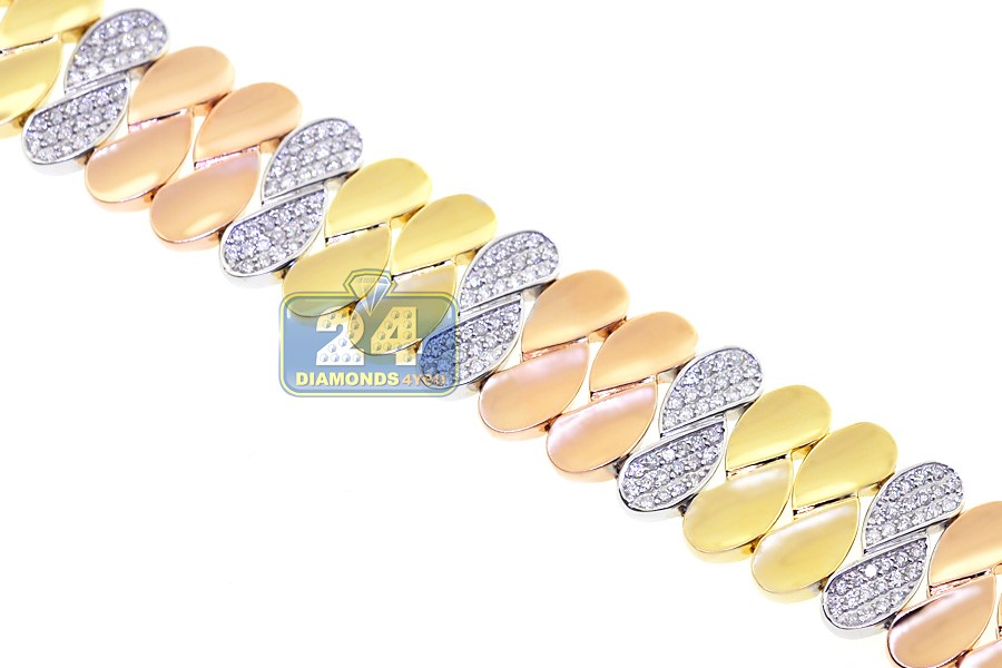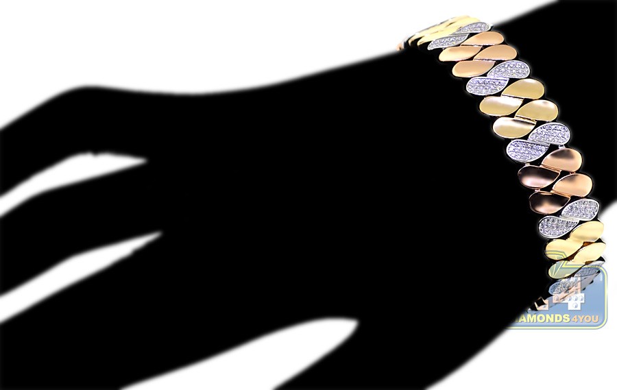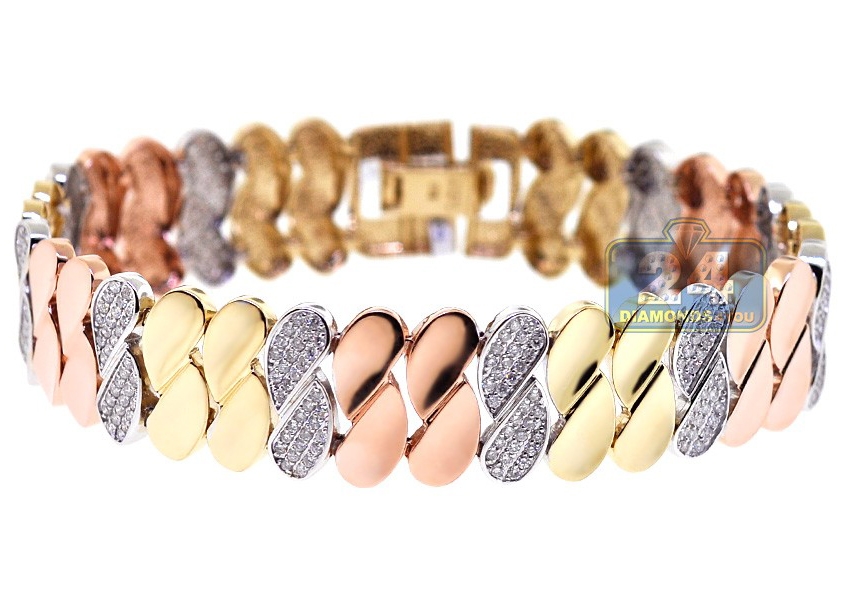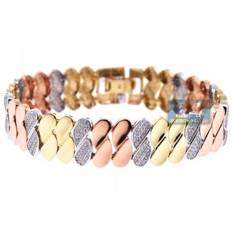 Modern and sophisticated, this diamond bracelet elevates any attire! It's professionally handmade of lustrous 14k white, yellow and rose gold. The piece of jewelry is encrusted with 2.11 carats of icy white round brilliant-cut diamonds. Our women's diamond bracelet has length of 8 inches and width of 15 mm. Drape her wrist in this gorgeous diamond bracelet!