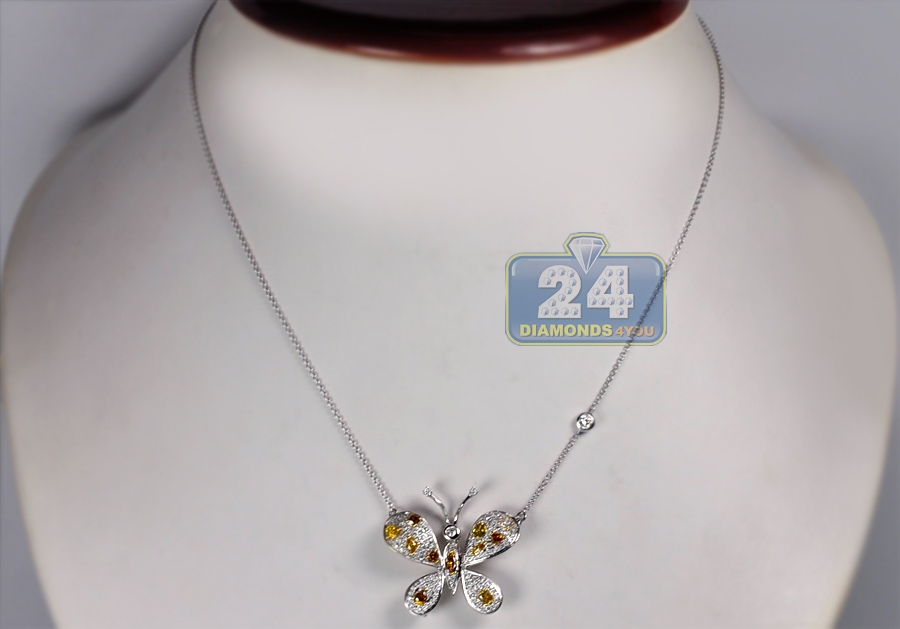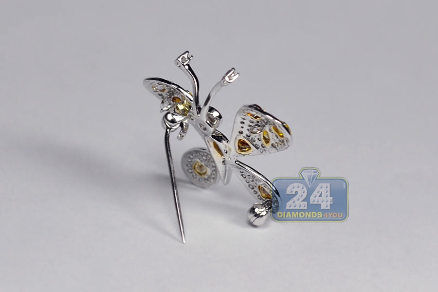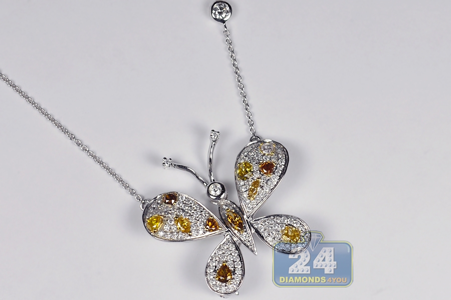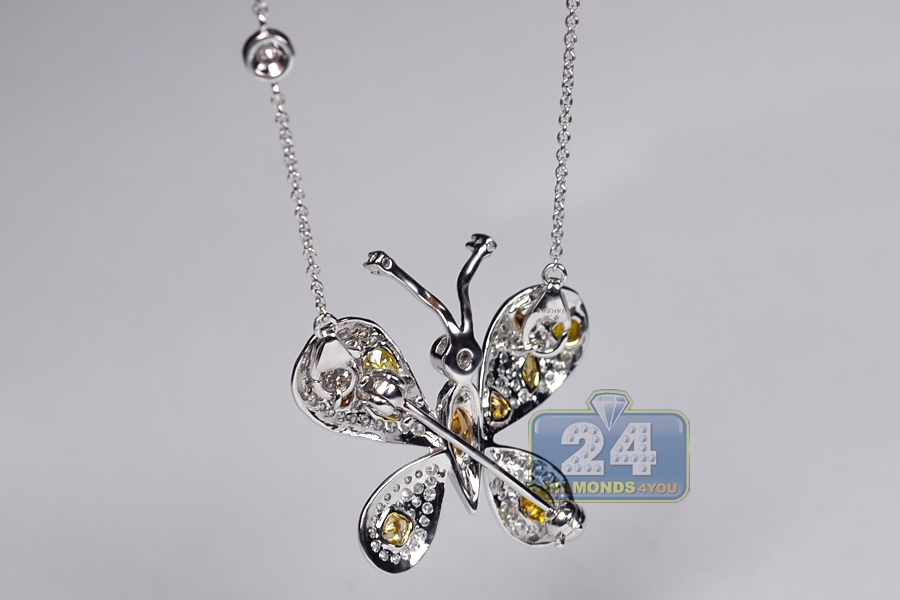 Change the look instantly by adding a fine chain to breathtaking fancy diamond butterfly brooch! Artfully crafted in lustrous 14k white gold, it's set with genuine not-enhanced fancy yellowish diamonds and icy white round brilliant-cut diamonds, all totaling 1.89 carat. Our women's diamond butterfly measures 26 x 28 mm, and comes with a chain of 17 inches in length. This gorgeous diamond necklace is a wearable work of art!