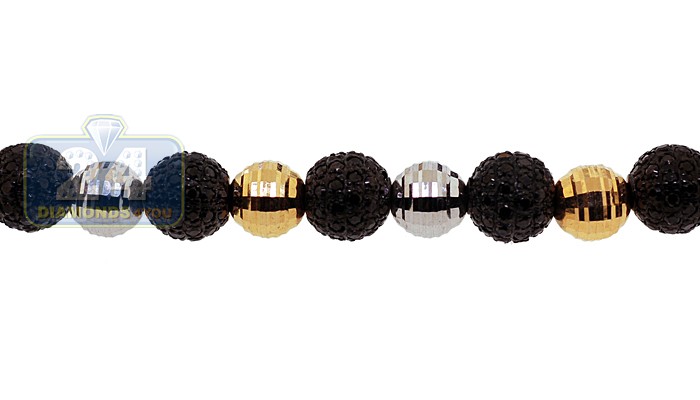 This unique men's bead bracelet features 15 diamond-cut finish bead artfully made of 14 karat yellow and white gold as well as fourteen diamond balls created of black rhodium plated stainless steel, which studded with 10.50 carats of round-cut natural black diamonds. All the beads are woven through 14 karat gold chain. The piece measures 9 inches in length, and its beads are 7 mm. This shambala style bracelet can give you a simple yet stylish accessory that can work with many styles!