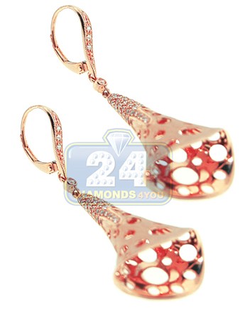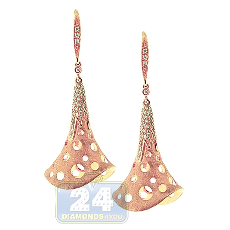 These women's dangle earrings are design in funky handbell style. They're artfully handmade of unique 14 karat rose gold, and highly polished for ultra sparkling look. Our drop earrings are accented with icy white round brilliant-cut natural diamonds, all totaling 0.36 carat. The pair measures 50 mm in hanging length and 18 mm in width. Amazing and impressive look!