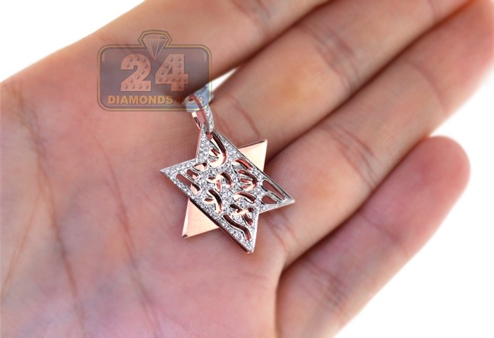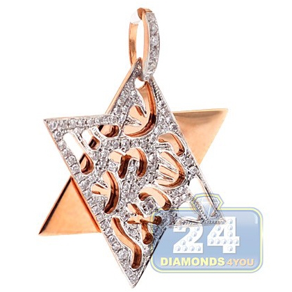 Keep your faith close to your heart with this beautiful diamond Star of David pendant! Professionally crafted in glistening 14 karat rose gold, it has polished smooth finish. Jewish pendant is set with 0.41 carat of icy white round brilliant-cut natural diamonds (SI1-SI2, G-H). Our diamond religious pendant measures 32 mm in hanging length and 22 mm in width. This diamond Jewish pendant is an unique way to express your religious devotion!