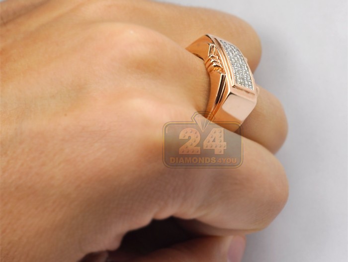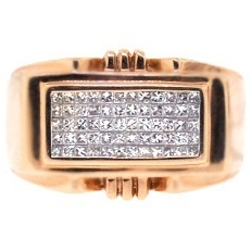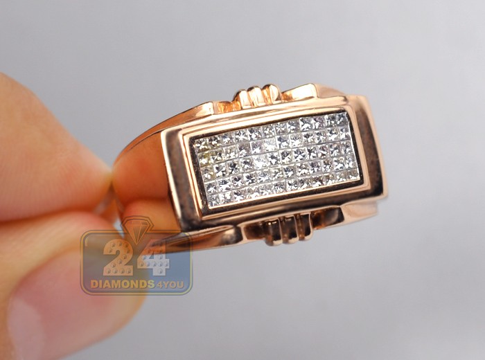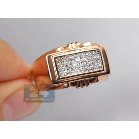 Handmade of fancy 14k rose gold with highly polished finish, this men's signet features a classic design with 0.80 carat of white princess cut invisible set diamonds. Each precious stone is handpicked to match, has eye clean and sparkling brilliants of G-H color and SI1-SI2 clarity. What a stylish addition to your daily outfit!