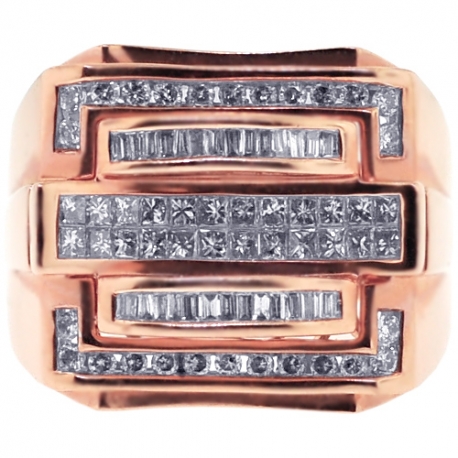 Masculinity and confidence go together in our diamond signet ring! Gorgeously crafted in warm 14k rose gold with perfectly polished finish, it is encrusted with 2 rows of invisible set princess cut diamonds in the center that surrounded by baguette and round cut diamonds. The brilliants feature H-I color with SI1-SI2 clarity meaning to be eye clean and sparkling. These precious stones totaling 1.30 carat. Our men's stylish ring is a truly timeless piece of jewelry!