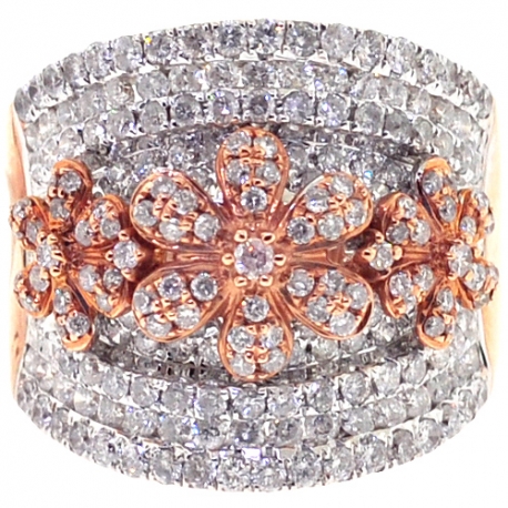 Here's an elegant diamond flower ring to match your sophisticated personality! It's masterly manufactured from unique 14k rose gold, and high-polished for smooth sparkling finish. The piece is also amazed with 2.17 carats of icy white round brilliant-cut natural diamonds. It measures 19 mm in width. This women's diamond pave band is the ideal accessory to any outfit!