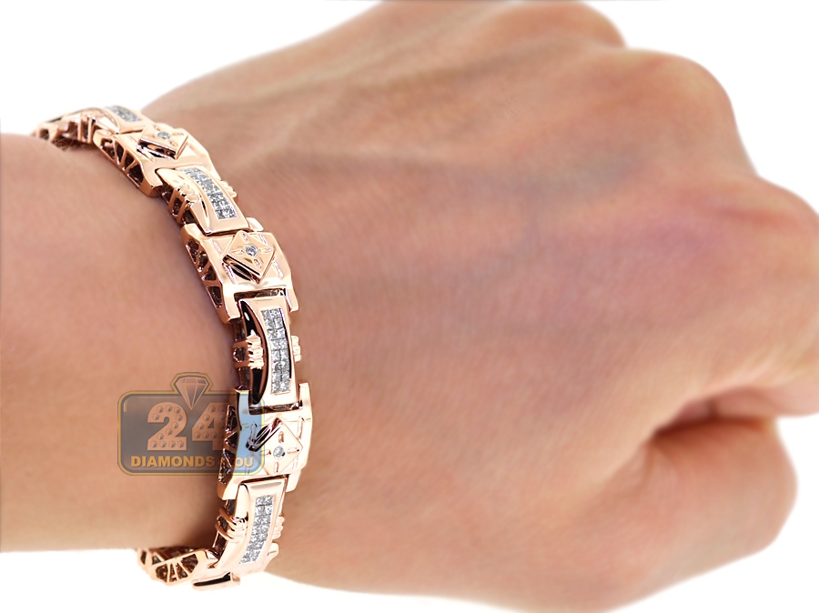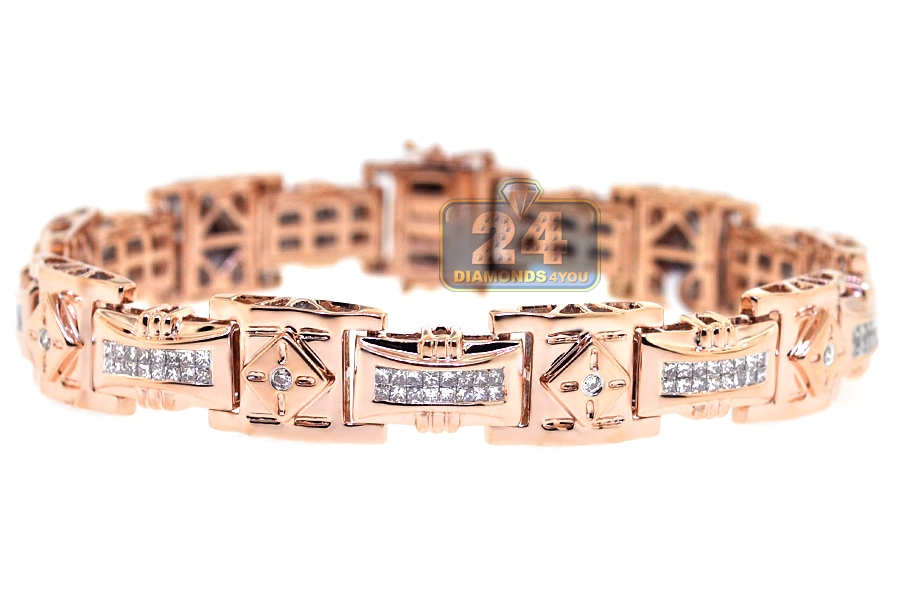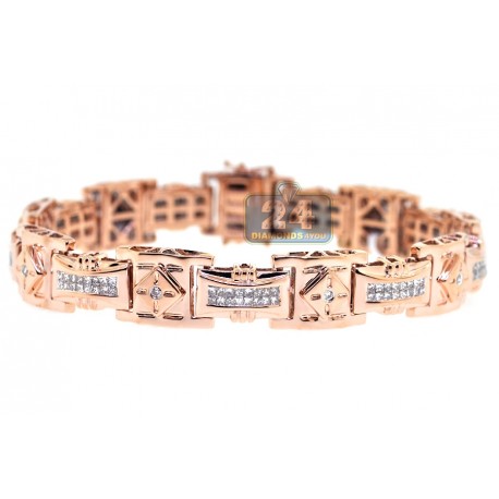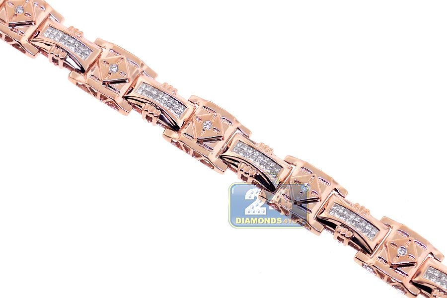 This diamond link bracelet is for a man who appreciates durable and luxurious look! This piece of jewelry is handmade of lustrous 14k rose gold, and professionally encrusted with 2.38 carats of icy white round brilliant-, princess-cut diamonds. The piece of jewelry measures 8.5 inches in length and 11 mm in width. This men's diamond wrist bracelet is a symphony of color, sparkle and style!