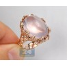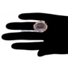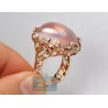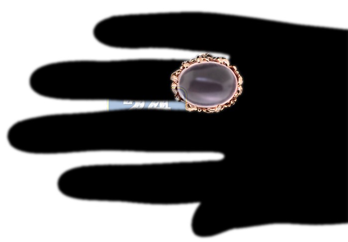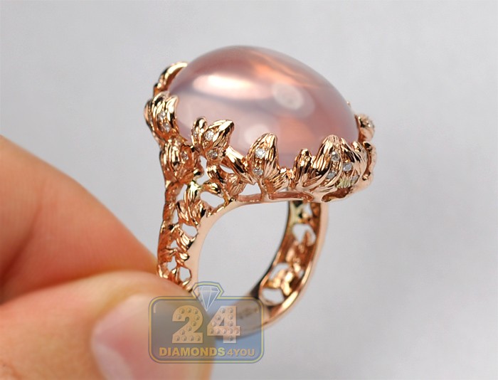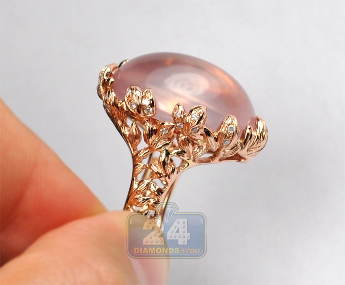 What a chic jewelry ring inspired by vintage motifs! Amazing floral patterns are completely covering this gorgeous vintage ring for women! Its durable setting is artfully handmade of solid 14 karat rose gold with perfectly polished finish, and skillfully encrusted with icy white round cut diamonds weighting 0.24 carat in total. The center piece of the antique style ring is showcasing a stunning natural pink cabochon quartz that weights 26.15 carat. Feel like a real queen with this exquisite large cocktail ring!
