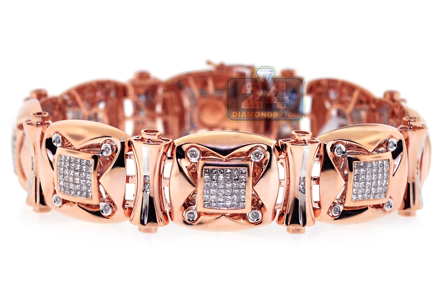 This diamond link bracelet is for a man who enjoys magnificent and modern look! Artfully produced from unique 14 karat rose gold, the piece features high-polished sparkling finish. Our men's diamond bracelet is amazed with 3.88 carats of icy white princess-, round brilliant-cut real diamonds. It has length of 8.25 inches and width of 18 mm. This diamond wrist bracelet is a symphony of color, sparkle and style!
