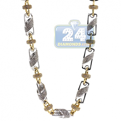 Our diamond link chain has a unique design for a finical person! It's skillfully made of solid 14k gold of white and yellow colors with precisely polished shiny finish. The bead link necklace is decorated with 17.51 carats of lustrous white round brilliant-cut natural diamonds. This men's diamond chain measures 30 inches in length, 7 mm in width, and closed by a classic lobster clasp. The diamond necklace for men is ready for your next fancy event!