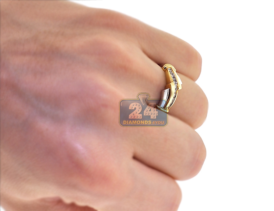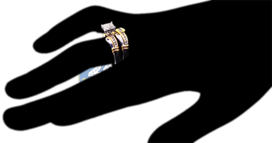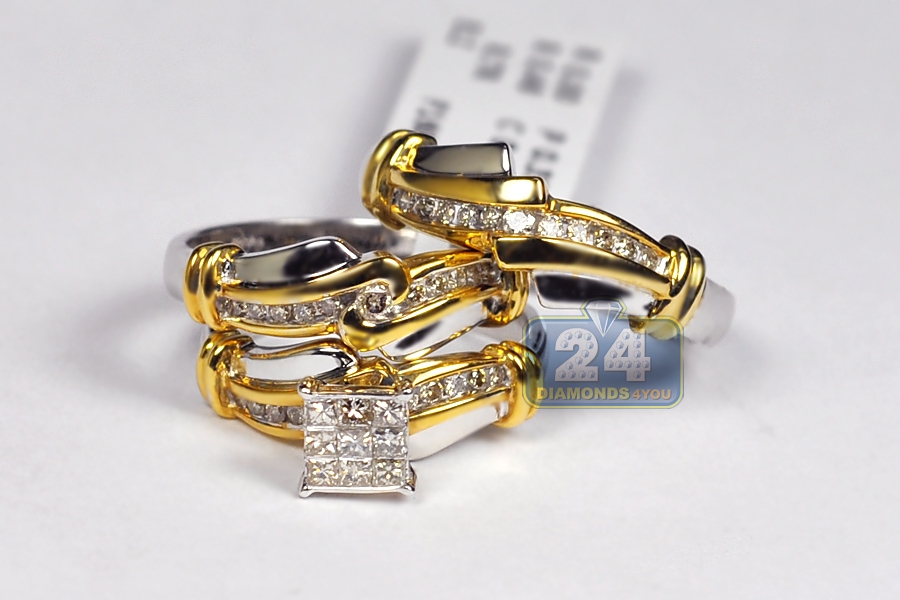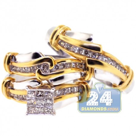 When it comes to two tone jewelry there is no doubt, it always stays in fashion and great to wear with almost any outfit! This stunning diamond bridal set is not an exception... it would be a nice match to your white wedding dress, black tuxedo, regular grey suit and even a blue pair of jeans with a white t-shit! Yes, it is rather universal and does not made to be worn once. The set includes two tone women's engagement and wedding rings, men's wedding band. All the rings are expertly handmade of combined 14k white and yellow gold, and professionally encrusted with white round and princess diamonds totaling 0.82 carat. Lady's engagement ring features nine princess cut invisible set diamonds making the square shaped centerpiece. Enjoy the splendid appearance of these fabulous jewelries!