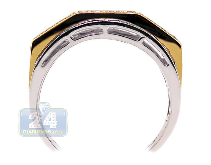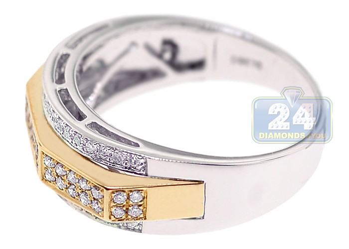 Bold and sharp! This handsome ring for men will surely make heads turn! The center area of the ring is masterly designed with warming 14k yellow gold and skillfully accented with two rows of natural icy white round cut sparkling diamonds making a stylish contract. All precious stones are G-H color and SI1-SI2 clarity. Massive band is professionally handmade of cool 14k white gold with highly polished finish.