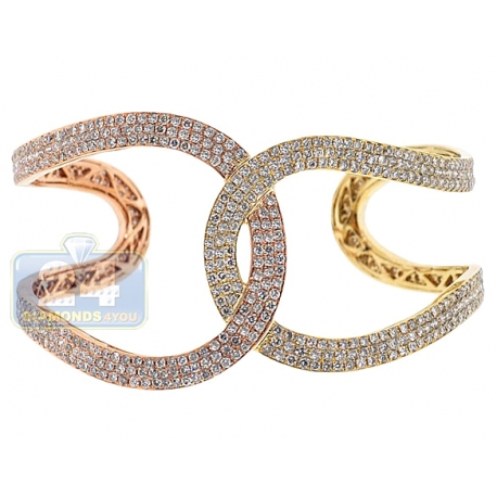 Bring your jewelry collection to the next level in fashion with this elegant and shine diamond cuff bracelet! This unique piece of jewelry is artfully made of 14 karat yellow and rose gold, and features fabulous interlocking design of two lines which adorned with beautiful icy white round brilliant-cut natural diamonds totaling 11.20 carats. Our women's diamond bracelet measures 8.5 inches in length and 41 mm in width. Update your look with this trendy cuff bracelet!