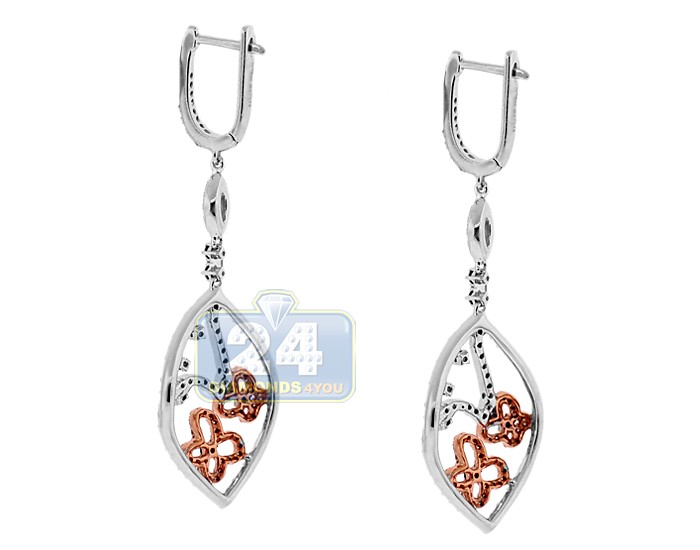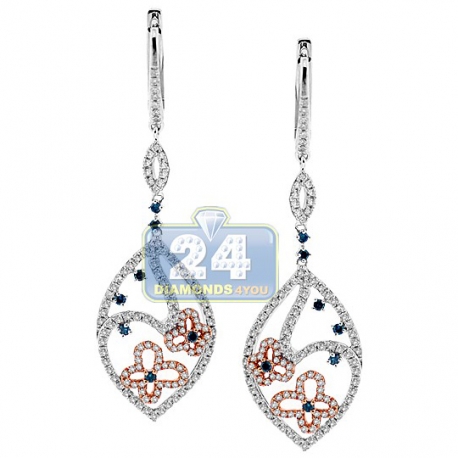 These alluring diamond dangle earrings feature an attractive butterfly design. The pair is artfully produced from 14 karat gold of white and rose colors with highly polished shiny finish. They're encrusted with icy white and enhanced blue round brilliant-cut natural diamonds of 1.18 carat. Our women's diamond earrings measure 50 mm in height and 15 mm in width. Unique and elegant, they will add sparkle and style to any wardrobe!