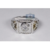 Classic design with vintage accents of this men's signet features gorgeously set in a cluster way round cut diamonds. A square shaped setting is handsomely framed by a row of sparkling diamonds on each side. Our ring is expertly crafted in high polished 14k white gold with yellow gold accents. The shoulders of the ring feature yellow gold hidden under a magnificent diamond pattern.