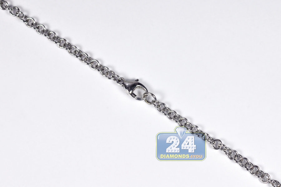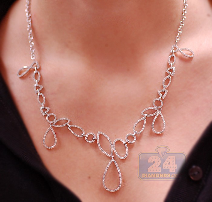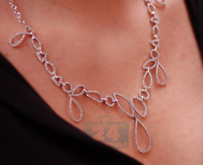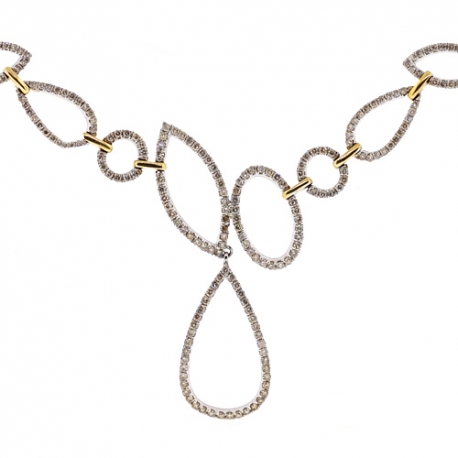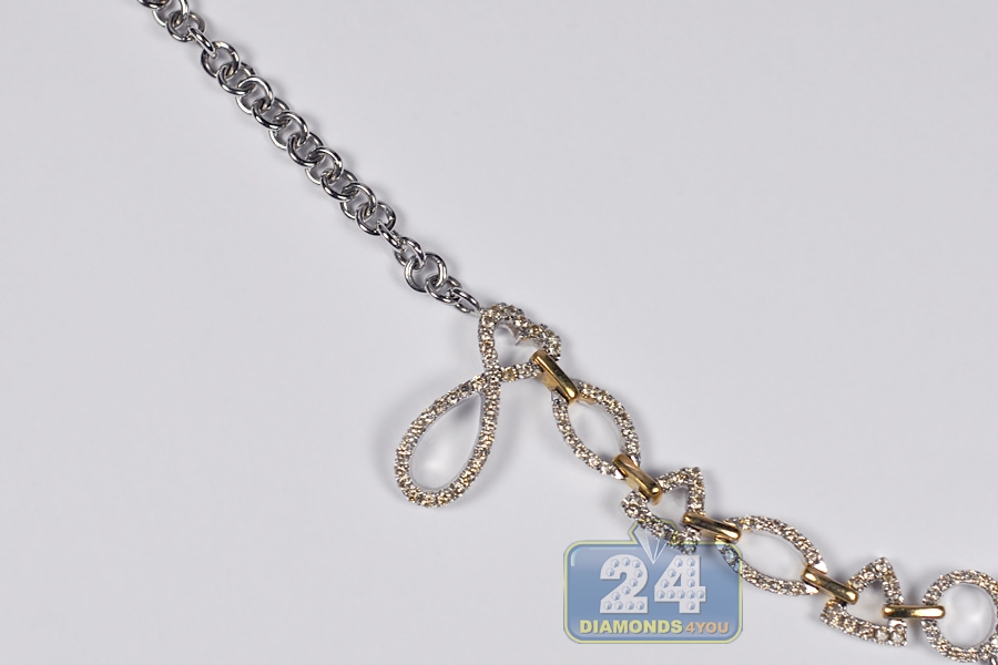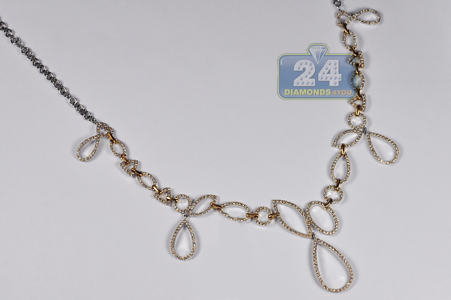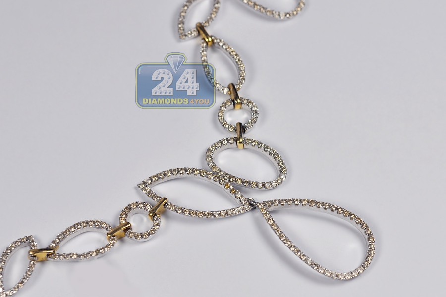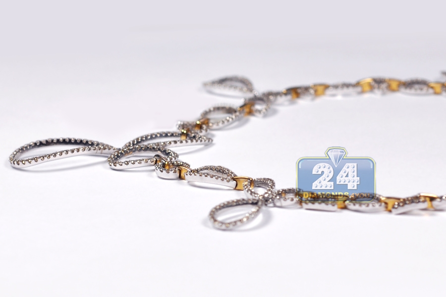 Every woman deserves a stunning piece of jewelry, and this gorgeous diamond lariat necklace is an excellent choice! Crafted in solid 14 karat gold of white and yellow colors, it features fancy geometric design with precisely polished shiny finish. Intricate yet so beautiful links are encrusted with icy white round brilliant-cut diamonds weighting 3.12 carats. Our women's diamond necklace measures 18 inches in length around the neck, and width of the links varies from 5 to 46 mm. With its elegance, the diamond drop necklace is an exquisite jewelry piece and extraordinary gift!