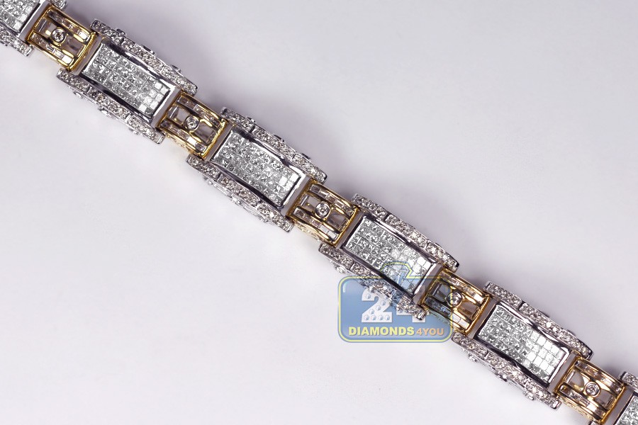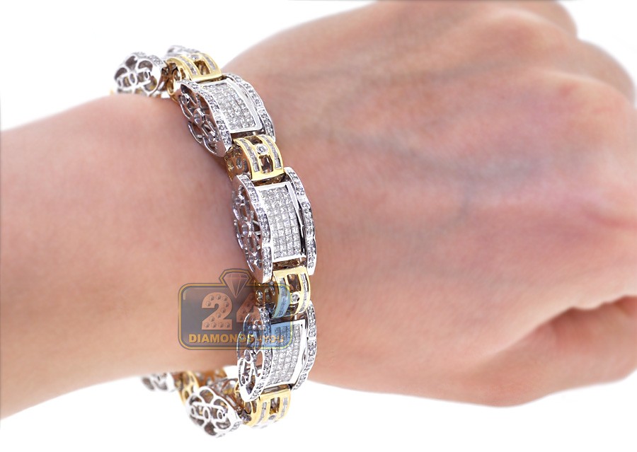 This masculine diamond link bracelet is the perfect gift for any man who likes luxury accessorizes! The piece of jewelry is professionally handmade of 14k white and yellow gold, and decorated with white round-, princess-, baguette-cut diamonds totaling 8.17 carats. Our men's diamond bracelet has length of 8.5 inches and width of 13 mm. Find an ideal gift for a friend or treat yourself to style with this diamond bracelet!