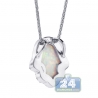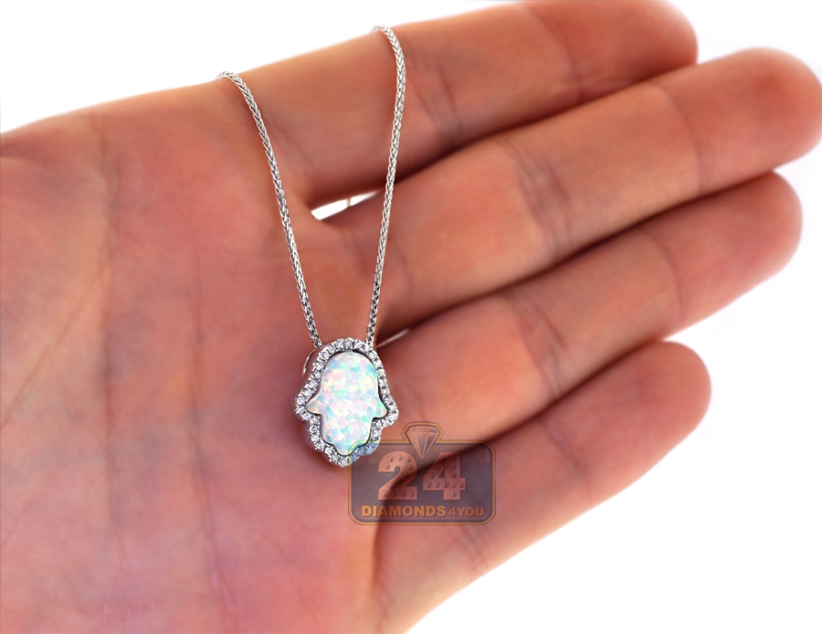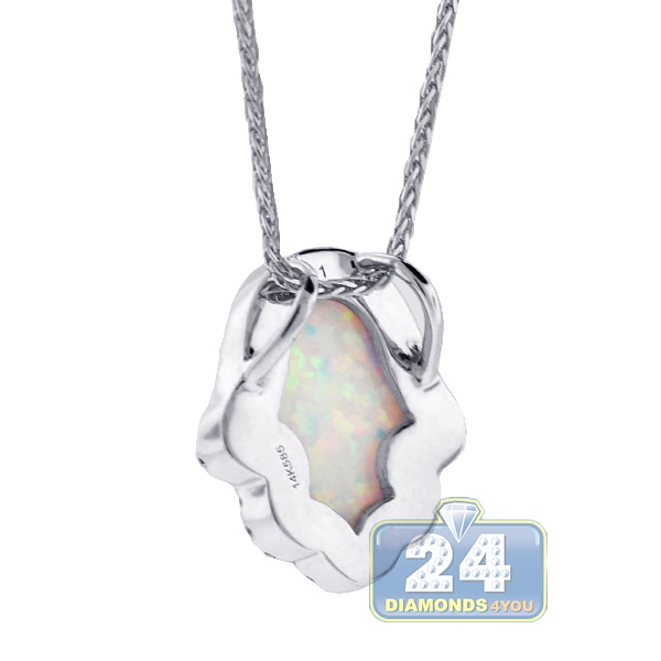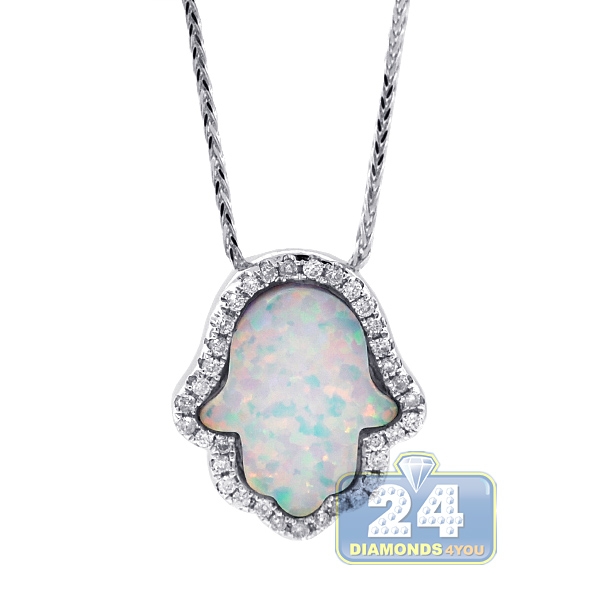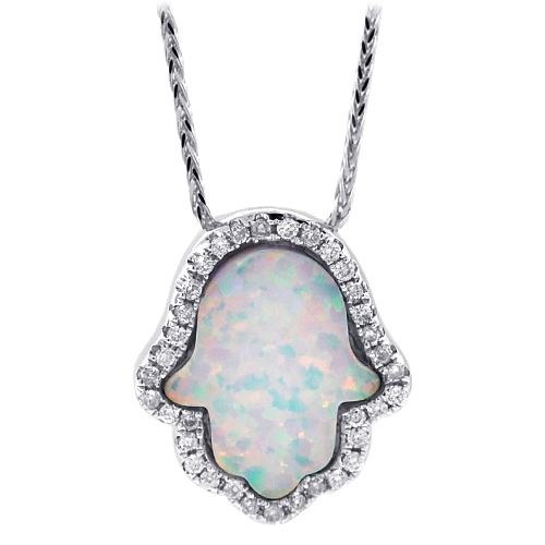 14K White Gold 0.20 ct Diamond Opal Hamsa Hand Necklace