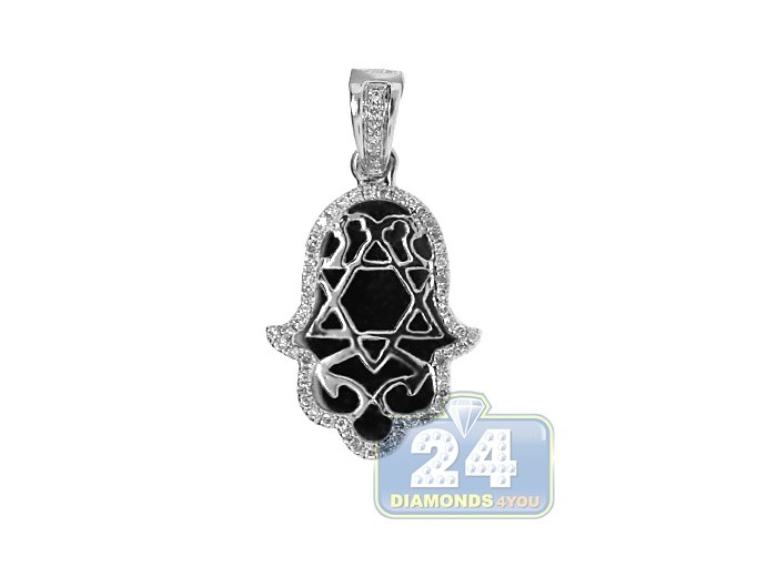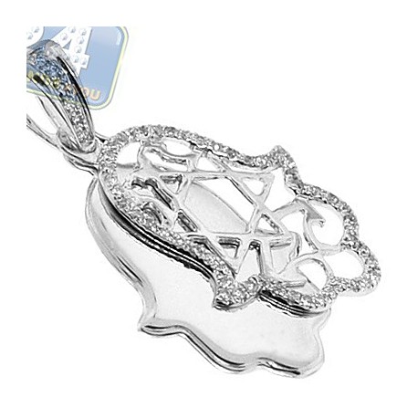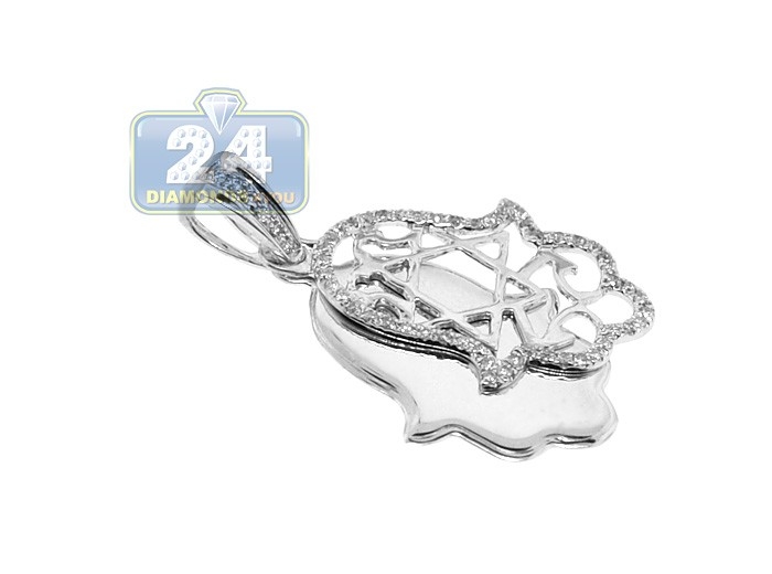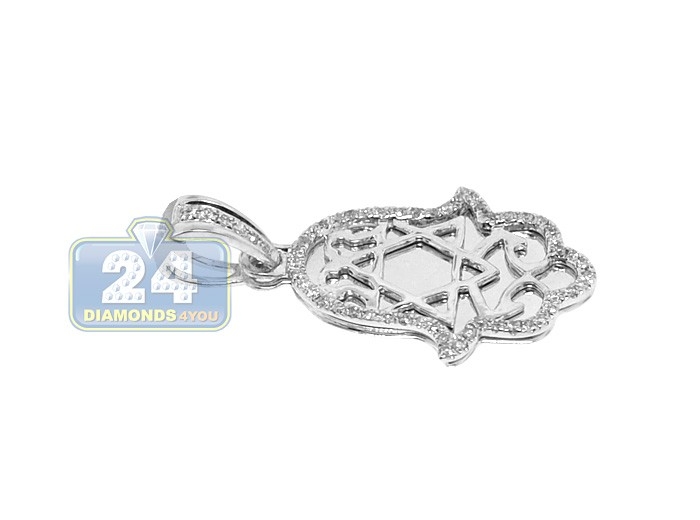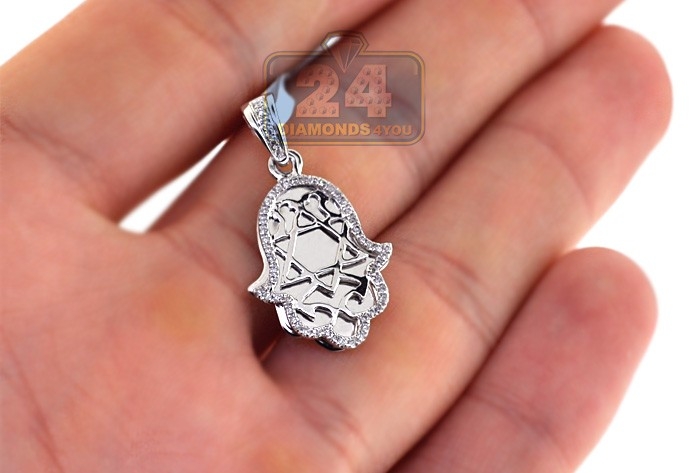 Luxurious and sophisticated, our fancy Hamsa amulet is sure to protect from envious eyes around! In addition to its symbolic meaning, the pendant features one of a kind appearance with two variously designed layers: solid and the openwork one. It is artfully handmade of lustrous 14k white gold, finished with high polished, and encrusted with genuine 0.21 carat of white diamonds. These brilliants are SI1-SI2 clarity and G-H color. Enjoy such our diamond Hamsa Hand pendant for a daily protection and visual satisfaction!