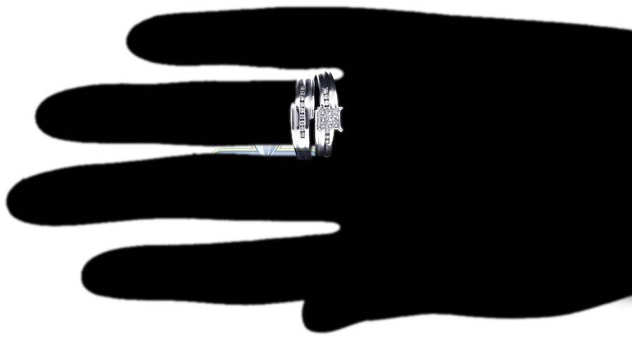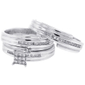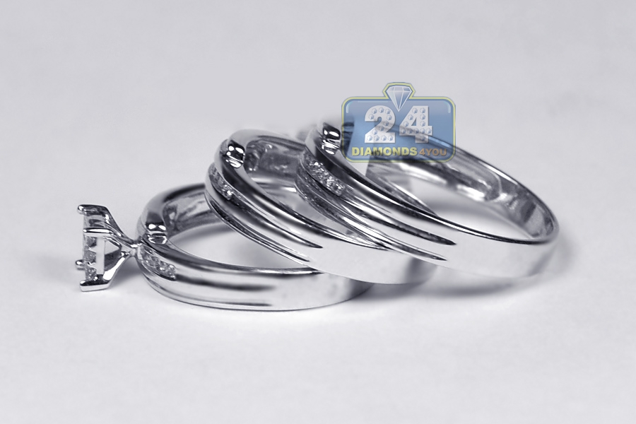 Make that special moment unique with our amazing diamond wedding ring three-piece set! It features an engagement ring, men's and women's wedding bands. They ably crafted in cool 14k white gold, and set with icy white round brilliant-, princess-cut genuine diamonds totaling 0.30 carat. These outstanding bridal rings are a beautiful beginning of love!