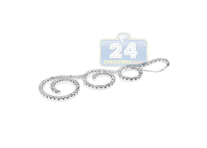 The glitter of white gold and the fire of diamonds combine to a beautiful effect in these uniquely elegant triple curl pendant! Skillfully crafted in cool 14 karat white gold, it has high-polished shimmering look. The dangling pendant is set with gleaming white round brilliant-cut natural diamonds weighting 0.57 carat (SI1-SI2 clarity, G-H color). Our women's diamond pendant measures 41 mm in height and 13 mm in width. A gorgeous evening look!