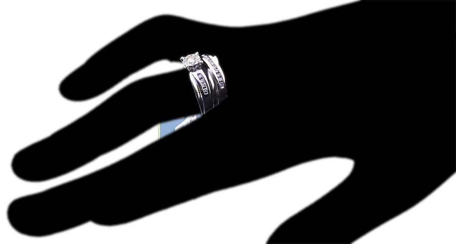 Classic and elegant like round cut diamonds, this sparkling diamond bridal set will be a perfect match for that special day in your life! Presenting women's engagement and wedding rings as well as men's wedding band designed to get that splendid look to last forever! The lady's rings features an illusion centerpiece that makes it stand out from other similar jewels. All the rings are professionally manufactured of shimmering 14k white gold and expertly handset with icy round diamonds. The brilliants are eye clean and have the total weight of 0.64 carat. This diamond set the real treasure to be enjoyed for a lifetime!