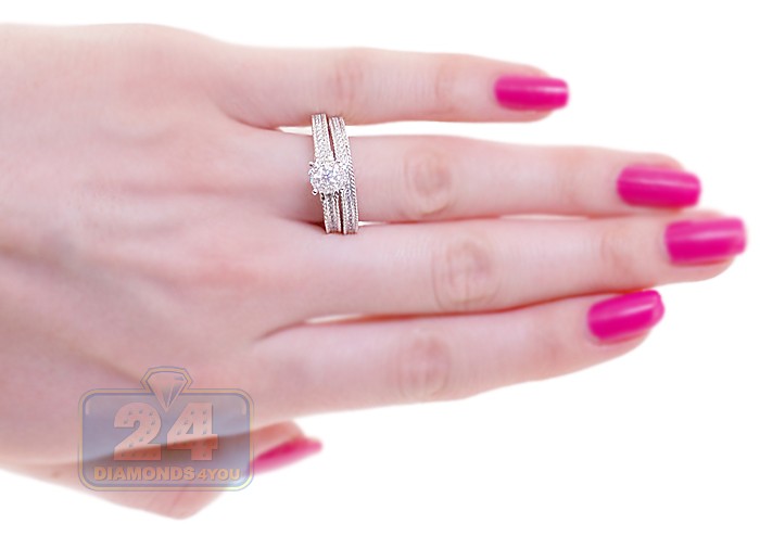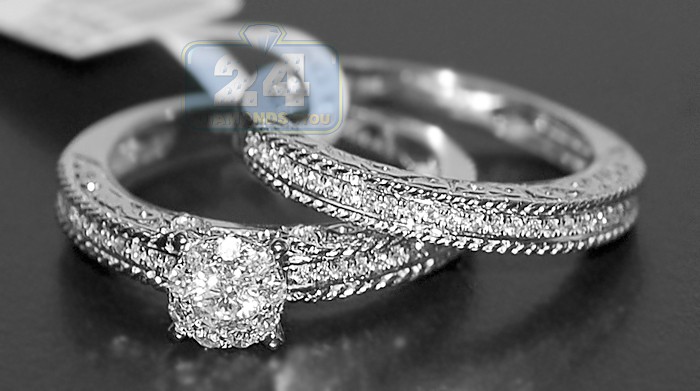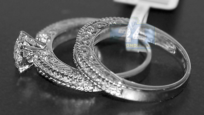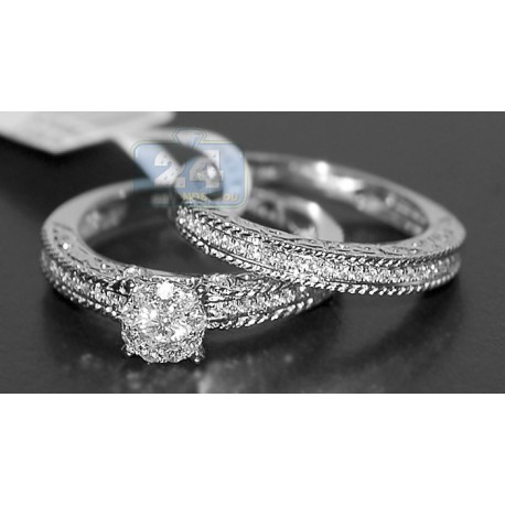 Show your taste for vintage extravagance with our 14k white gold engagement rings set! Luxurious style and shimmer of icy white and sparkling round cut diamonds gives a head-turning effect. Stunning crown holds a round cut center stone surrounded by a row of smaller diamonds. Each dazzling side of the shoulders features genuine round cut brilliants combined with the unique antique pattern. The accompanying 14k white gold wedding band is handset with twinkling round cut diamonds and adorned with a timeless pattern as well.