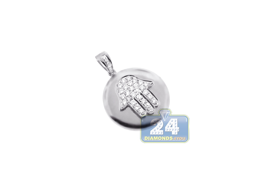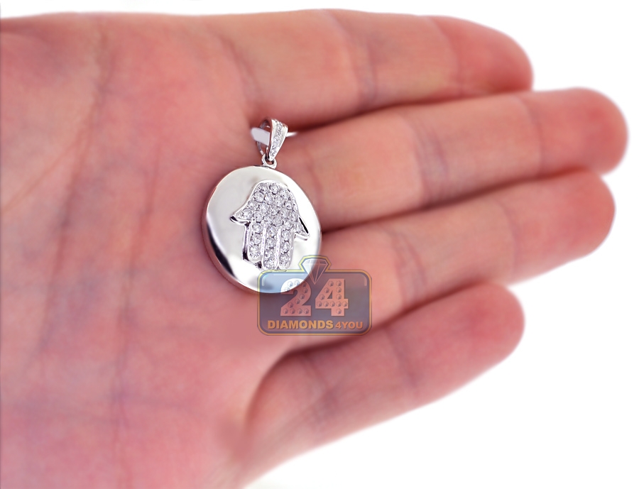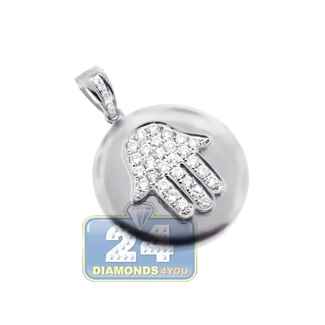 This diamond Hamsa pendant, a symbol of protection, is a spiritual addition to your jewelry collection! Professionally crafted in cool 14k white gold, it's precisely polished to add very shimmering look. Hamsa Hand pendant is accented with 0.64 carat of gleaming white round brilliant-cut diamonds (SI1-SI2, G-H). Our diamond religious pendant features dangling length of 29 mm and width of 20 mm. Choose the amazing diamond Hamsa medallion to be your talisman of good fortune!