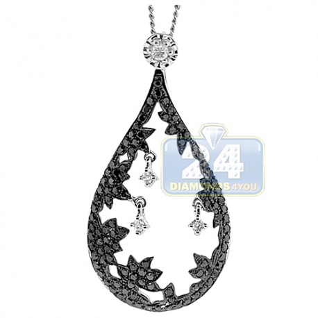 This beautiful women's pendant features a stunning openwork teardrop design adorned with dazzling enhanced black and icy white round-cut diamonds. Total diamond weight is 0.67 carat. The setting is professionally handmade of solid 14k white gold, and has precisely polished smooth finish. The drop pendant measures 37 mm in total height and 17 mm in width. This diamond teardrop pendant is the perfect choice for grand occasions!
