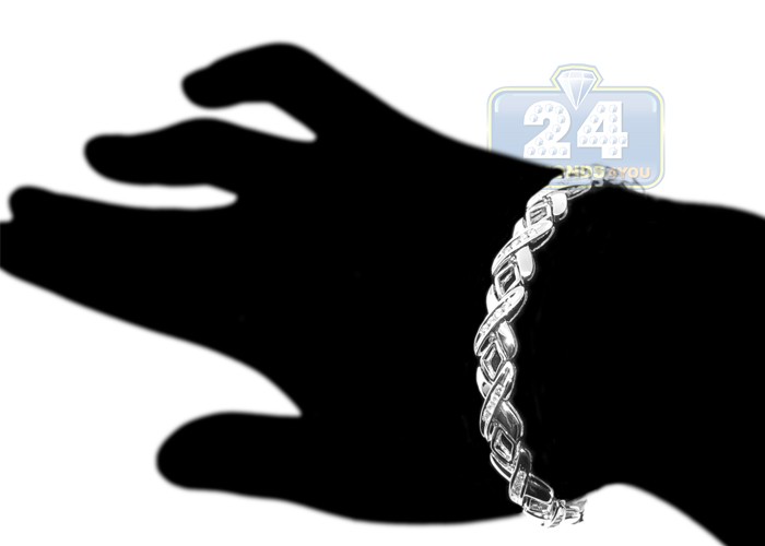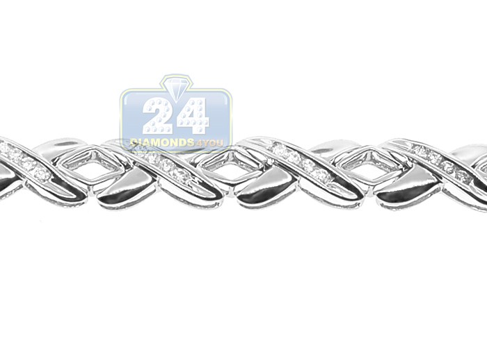 Let this beautiful hugs and kisses bracelet sparkle on your wrist! It's artfully manufactured from cool 14k white gold with highly polished shimmering finish. X-shape links are channel set with 0.73 carat of icy white round brilliant-cut genuine diamonds. Our women's diamond bracelet has length of 7 inches and width of 7 mm. You will fall in love with this diamond X link bracelet!