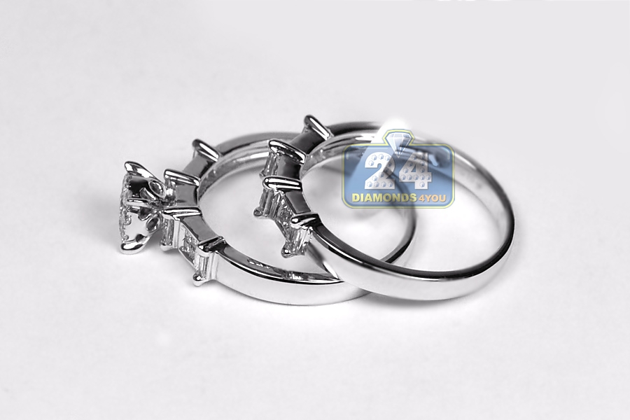 What a breathtaking trio! If you are a fan of diamonds, you will not miss this stunning bridal set featuring three various cut of brilliants! The jewels are handcrafted in cool 14k white gold, high polished for smooth and bright look. This gorgeous set includes women's diamond engagement ring and wedding band that are expertly accented with 0.81 carat of genuine white princess, baguette and round cut diamonds. Each stone is sparkling and eye clean, with SI1-SI2 clarity and G-H color. Enjoy this special brilliance of mixed diamonds with such a lovely symbol of your relationship!