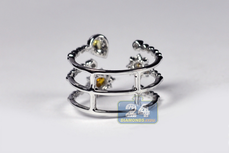 Looking for an original and light design? Our diamond 3 rows open cuff ring is a mesmerizing find! The setting is artfully made of cool 14k white gold, and polished for ultra-sparkling smooth finish. This women's fine ring is encrusted with oval- and pear-shaped enhanced canary diamonds which surrounded by icy white round brilliant-cut genuine diamonds. Total stone weight is 0.83 carat. Width of triple band ring varies from 10 to 15 mm. This diamond cuff ring makes a fashion-forward statement!