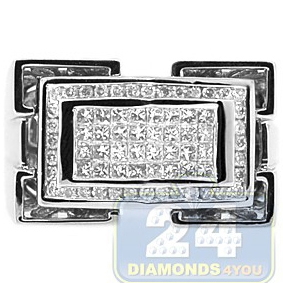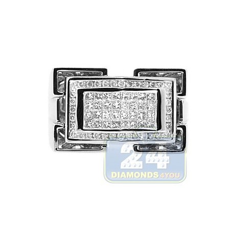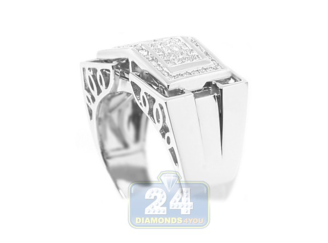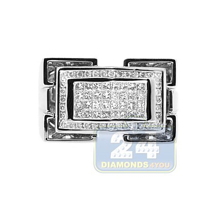Make a really bold statement with our handsome signet! A rows of icy round cut brilliants compliment the stunning center piece invisibly handset with magnificent princess cut diamonds. An impressive high polished 14k white gold setting is artfully accented with vintage pattern for more stylish and sophisticated look. This masculine jewelry piece will surely bring elegance and years of enjoyment!
