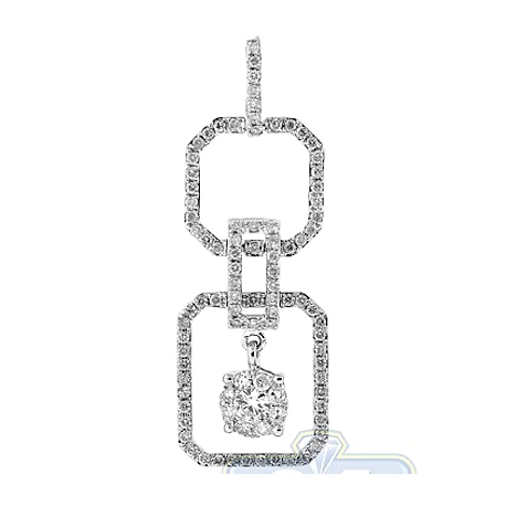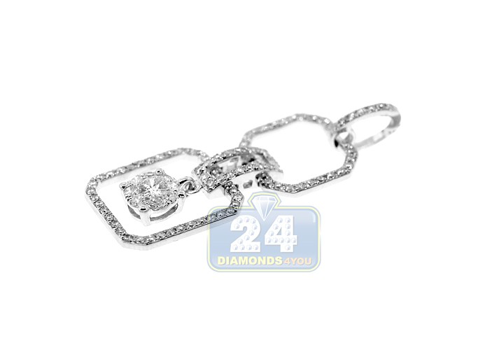 Truly unique design of our diamond pendant features two open octagon frames connected by a central drop piece. Professionally handmade of solid 14k white gold, it has high-polished smooth finish. The dangling pendant is accented with gleaming white round brilliant-cut natural diamonds weighting 0.88 carat. This women's diamond pendant measures 40 mm in total height and 14 mm in width. Gorgeous look anytime for any occasion!