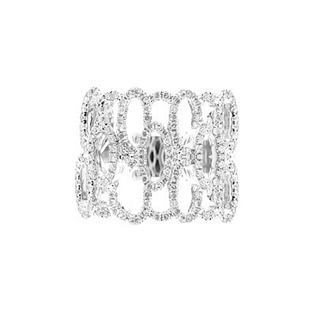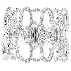 There is no doubt, you will be sparkling like a star without emptying your bank account with this gorgeous diamond band! The ring features an openwork design with absolutely stunning ovals! It is expertly handmade of cool 14k white gold with high polished finish, and professionally encrusted with genuine 0.88 carat of white round cut diamonds. These brilliants are absolutely eye clean and sparkling, with G-H color and SI1-SI2 clarity. What a major look for a such a minor price!