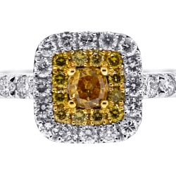 Our lovely diamond engagement ring will make the moment one to remember! It's ably made of lustrous 14k white gold; amazed with cushion brilliant-cut canary diamond in the center, that surrounded with round brilliant-cut diamonds of white and canary colors, all totaling 0.91 carat. Canary stones are color-enhanced. This women's cluster ring is something of a dream! The ring is a part of the set. Earrings and necklace are also available.