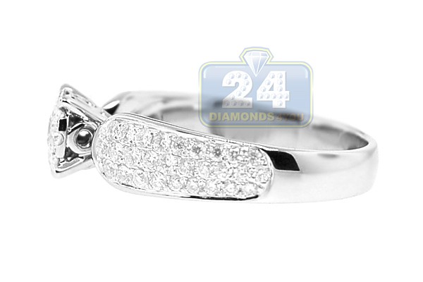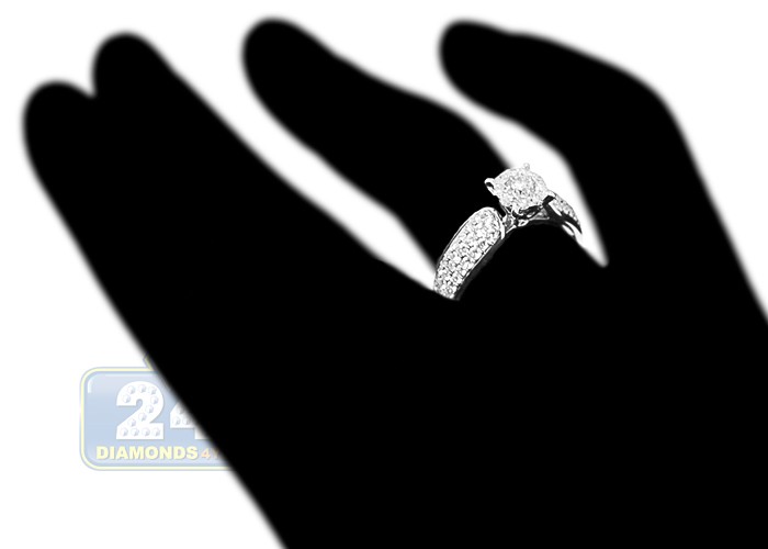 Simple, elegant, beautiful and affordable! Our engagement ring features a gorgeous setting crafted in cool 14k white gold with high polished finish. It holds a genuine round cut diamond in the center circled with small stones collar creating a large solid look of the center piece. The shoulders of the ring are expertly handset with a plenty of brilliants as well. All precious stones are sparkling, eye clean, and totaling 0.99 carat.