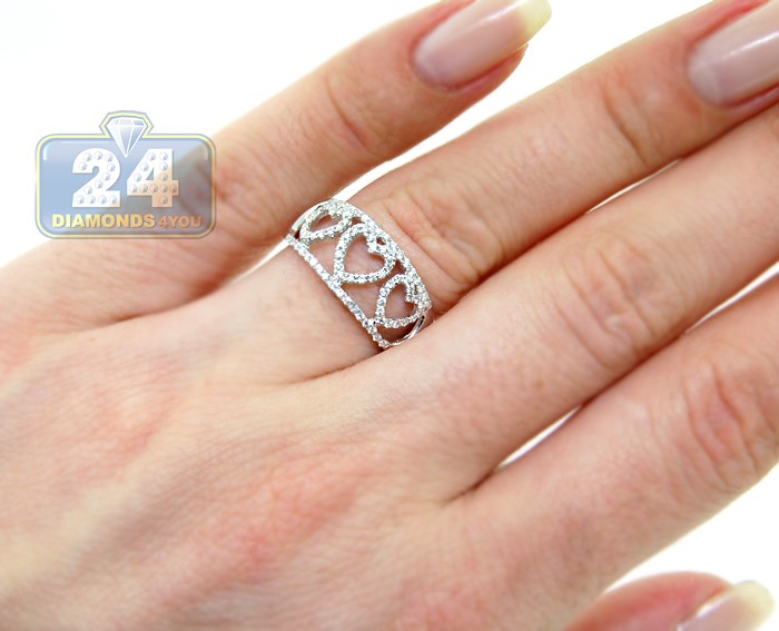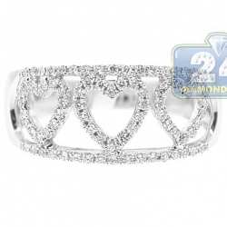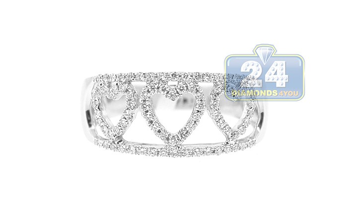 Symbolizing love and style, this exquisite ring features three beautiful openwork hearts gorgeously accented with icy white sparkling diamonds! The lovely trio is artfully bordered by two rows of precious stones as well. All brilliants are eye clean, sparkling, with G-H color, SI1-SI2 clarity, and weighting approximately 0.33 carat in total. The setting of the band is skillfully handmade of highly polished 14k white gold.