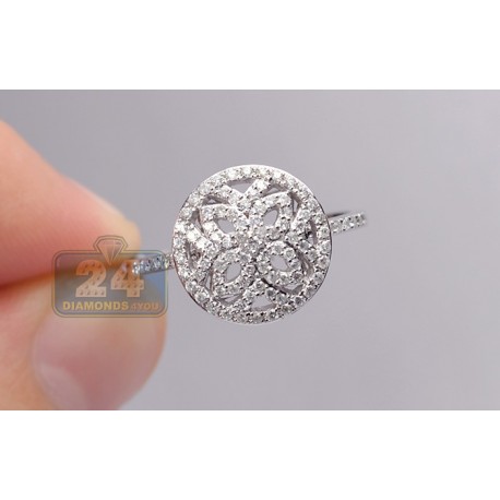 Adorn your daily look with our beautiful vintage inspired floral inspired design! The ring showcases a round shaped openwork pattern that is skillfully handmade of cool 14k white gold with highly polished shiny finish, and gorgeously encrusted with icy white round cut diamonds totaling 0.46 carat. All brilliants are absolutely genuine, eye clean and sparkling, with SI1-SI2 clarity and G-H color grades.
