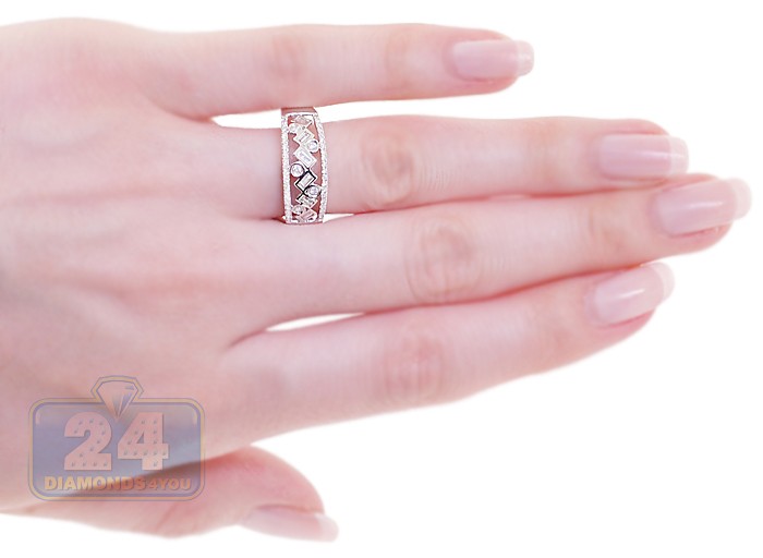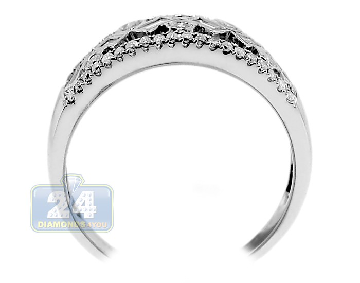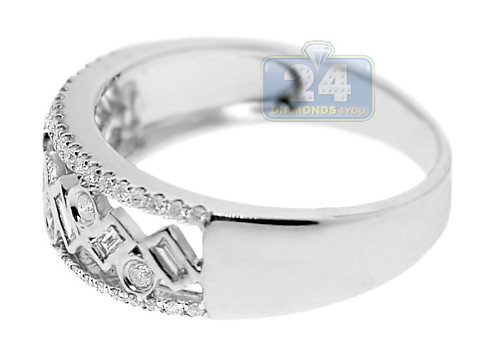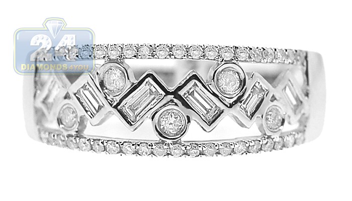 Elegant and sophisticated, our timeless band showcases a vintage inspired openwork design that is finely crafted from cool 14k white gold with highly polished finish! The piece is artfully encrusted with fancy row of mixed genuine round and baguette cut diamonds weighting 0.49 carat in total. Each precious stone features a bezel setting, and has G-H color with SI1-SI2 clarity grades.
