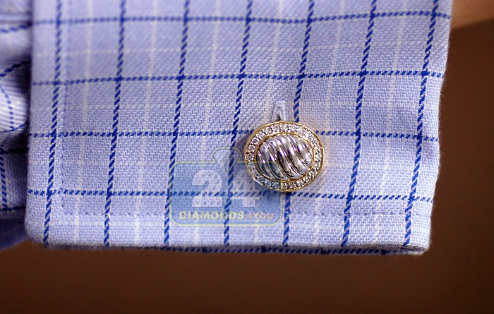 Traditionally elegant with the vintage accent, these oval cuff links are designed in lustrous white gold with accents of yellow precious metal on the sides. The set is great for any special event or occasion to complement your appearance! Presented 14k two tone gold 0.50 ct Diamond decorated oval mens cuff links are manufactured according to the highest jewelry standards by professionals with over 20 years of experience in the industry. The cuff links have approximately 48 pieces of diamonds totaling 0.50 carats, F-G color, VS1-VS2 clarity and weight 10 grams, 1/2 x 5/8 x 7/8 inches are dimensions of each piece.