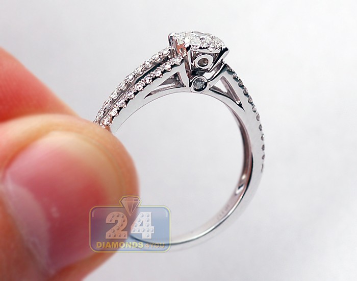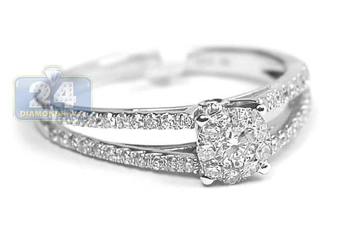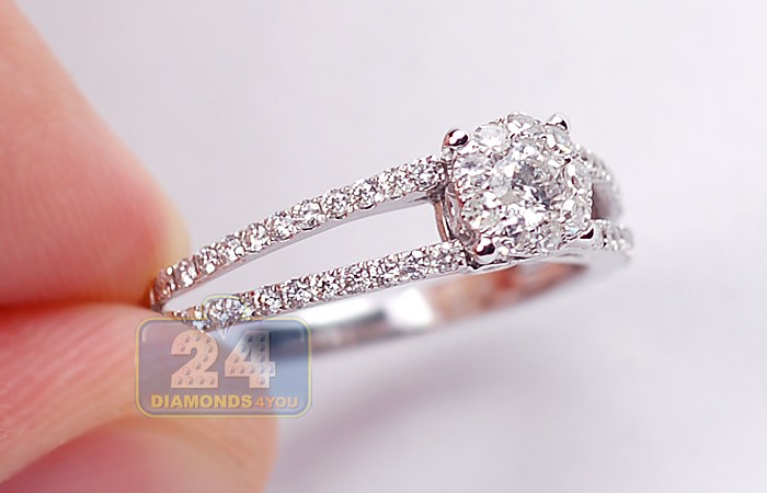 Express your deepest feelings with such an elegant and exquisite bridal ring! Absolutely sparkling and eye clean diamonds sparkle from a highly polished 14k white gold setting. Small genuine diamonds are masterly handset on the center as a cluster and on sides of the ring creating more rich and glamorous look! Each brilliant is G-H color with SI1-SI2 clarity. This is a symbol of love to treasure forever!