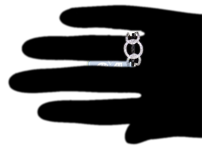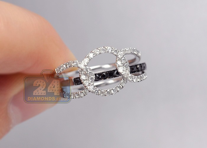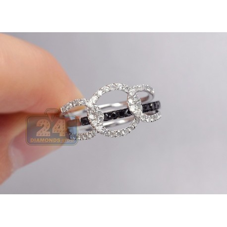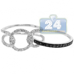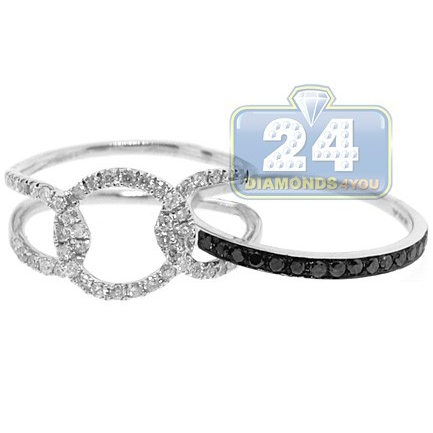 You are looking at something unique and elegant! Our lady's set showcases two absolutely differently styled rings that could be worn together or separately! The first one features an openwork design with a large circle in the center, and icy white round cut diamonds masterly handset all over it. Second band offers a timeless look with a single row of majestic black diamonds. Both jewelry pieces are professionally produced in cool 14k white gold with perfectly polished finish.