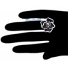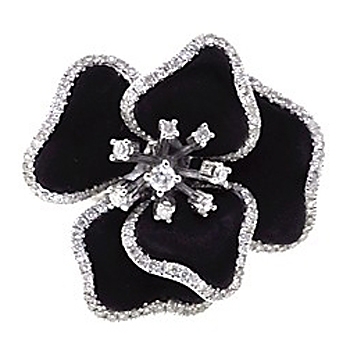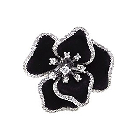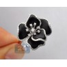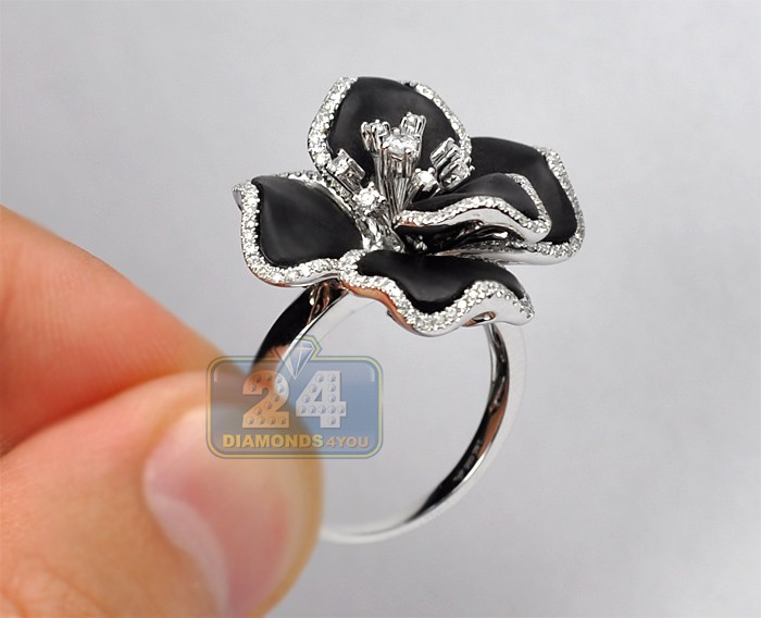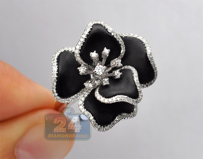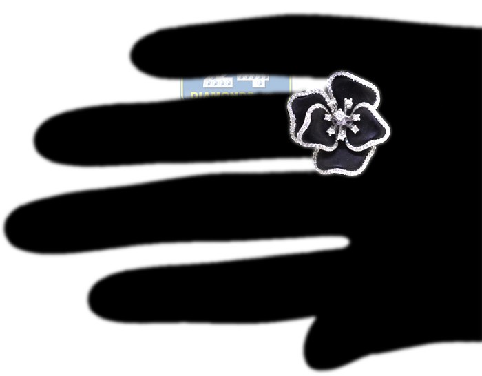 Look at this exclusive floral inspired ring! The unique design features the brilliance of white diamonds on black matte petals! The setting is artfully handmade of cool 14 karat white gold which is high polished for ultra smooth shiny finish. Our cocktail ring is skillfully accented with white genuine round cut diamonds totaling 0.83 carat. The top measures 24 x 24 mm, and the shank is 2.5 mm.