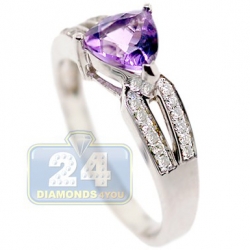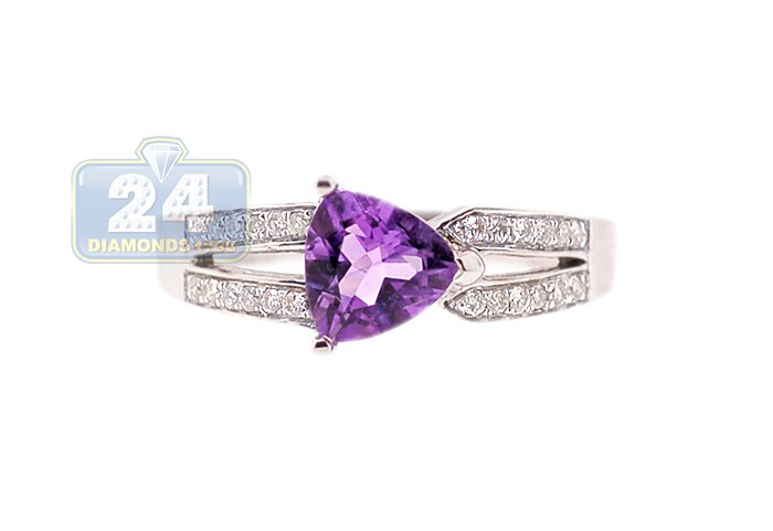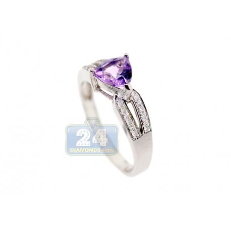 Our beautiful gemstone ring deserves a lot of compliments! Masterly crafted in cool 14k white gold with highly polished finish, this luxurious jewelry piece features a natural purple amethyst of triangle cut gorgeously placed in the center. The shoulders of the ring are skillfully encrusted with beautiful icy white round cut diamonds weighting 0.88 carat in total. Each brilliant is eye clean and sparkling, with SI1-SI2 clarity and G-H color.