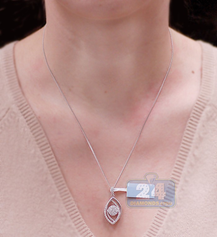 Our elegant diamond pendant has unique evil eye motif! Artfully made of cool 14k white gold, it' precisely polished for very sparkling finish. The drop pendant is set with icy white round brilliant-cut natural diamonds weighting 1.00 carat. This women's diamond pendant has hanging length of 31 mm, and eye itself is 23 x 14 mm. Add the evening elegance to your dress with this splendid piece of jewelry!