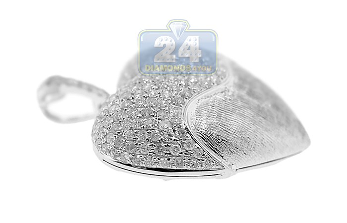 Love is all around! Express your romantic side with this diamond heart pendant! Its design features 1.10 carat of lustrous white round brilliant-cut natural diamonds set on the upper half of the heart and a unique brushed pattern on the bottom of this stunning pendant. Glittering bail twinkles with vivid round cut diamonds as well. The heart pendant is artfully handmade of solid 14k white gold with highly polished shiny finish. The piece measures 27 mm in hanging length, and the heart is 19 x 21 mm. Truly amazing find!