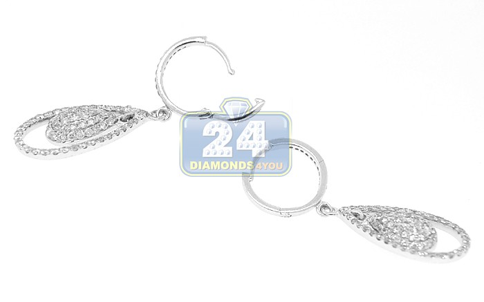 These spectacular diamond drop earrings glisten with precious pave set icy white round brilliant-cut diamonds of 1.10 carat. Professionally crafted in glistening 14 karat white gold, our women's dangle earrings have highly polished smooth finish. The diamond earrings are gorgeously set in graceful drop-style. They measure 32 mm in hanging length, 12 mm in width, and have a strong secure clasp and a very elegant look!
