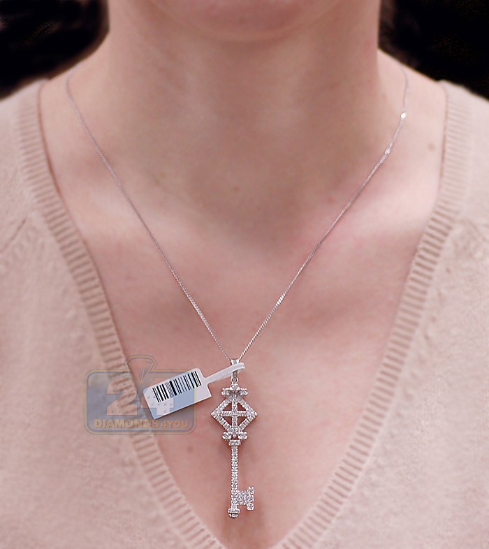 This splendid diamond key pendant will grab everyone's attention! Designed with vintage motif, it's masterly produced from solid 14k white gold with highly polished sparkling finish. The key pendant is amazed with 1.22 carat of lustrous white round brilliant-cut natural diamonds (SI1-SI2 clarity, G-H color). Our women's diamond pendant measures 60 mm in hanging length, and the key is 50 x 17 mm. Lovely design and icy diamonds make this diamond pendant even more special for someone you cherish!