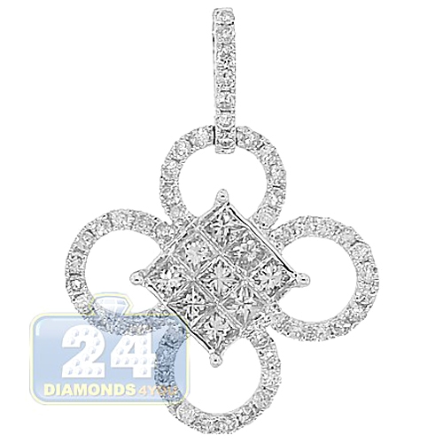 A classy diamond clover pendant for someone special! It's professionally crafted in solid 14k white gold, and highly polished for ultra smooth shiny finish. The drop pendant is decorated with 1.23 carat of gleaming white princess and round brilliant cut genuine diamonds (SI1-SI2, G-H). This women's diamond pendant measures 26 mm in height and 20 mm in width. Adorn your neckline with this perfect diamond flower!
