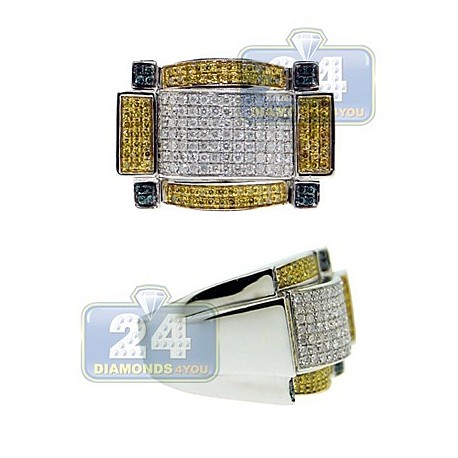 14K Gold 1.30 ct White Blue Yellow Diamond Mens Ring