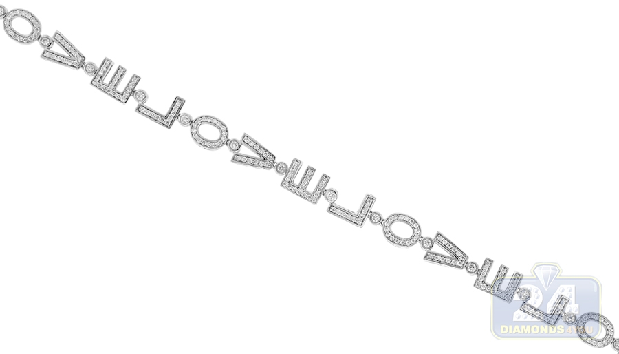 If you're looking for a romantic piece of jewelry for your beloved, our diamond LOVE bracelet is an interesting find! Artfully handmade of lustrous 14 karat white gold, it features highly polished smooth finish with white rhodium. The letters are accented with 1.40 carat of icy white round brilliant-cut natural diamonds. The piece weights about 13.5 grams. This women's diamond bracelet measures 7.5 inches in length and 7 mm in width. Make a lovely statement with this tennis bracelet!